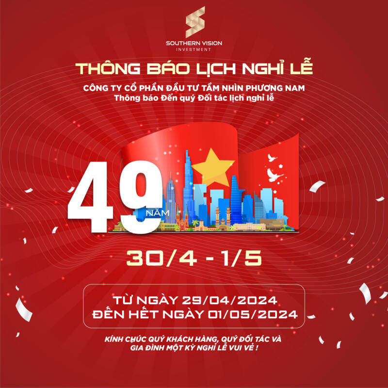 Công ty cổ phần đầu tư Tầm Nhìn Phương Nam – Southern Vision Investment (SVI Group) xin trân trọng thông báo đến Quý Khách hàng và Quý Đối tác lịch nghỉ lễ 30/4 – 1/5: